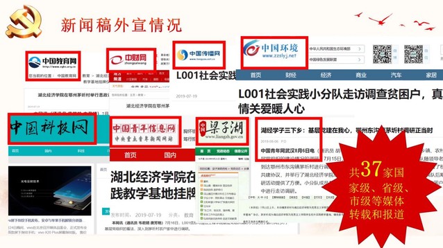 通过对调研的思考和探讨,团队共撰写了七篇学术论文和三篇调研报告,其中一篇论文荣获校一等奖。我们的实践活动得到了《中国教育网》《中财教育网》《中国青年网-三下乡》《梁子湖政府网》,《中国环境网》等37家国家级、省级、市级媒体的报道和转载,影响力广泛。