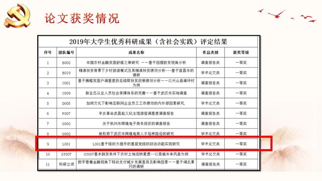 据悉为呈现中国特色社会主义进入新时代,全面从严治党向基层延伸,对党的基层组织建设提出的新要求的现状,L001信息与通信工程学院“基层党组织建设调研小分队”在肖述剑老师和陈祥老师的带领下,从组织力提升的视角对基层党组织政治功能实现的制度设计和策略形式进行了较深入的研究。小分队于2019年7月前往黄冈市、鄂州市以及武汉市进行了为期七天的暑期社会实践调研活动。