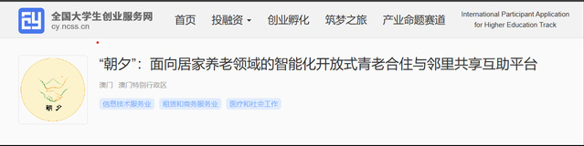 近日,“互联网+”大赛官网(全国大学生创业服务网)公示了第八届中国国际“互联网+”大学生创新创业大赛总决赛有关赛事获奖名单,其中由澳门科技大学和太阳集团官网8722学生联合组成的益行团队项目“朝夕-面向居家养老领域的开放式青老合住与邻里共享互助智能化平台”经校赛、省赛、国赛三级选拔推荐,喜获高教主赛道国家级铜奖,该奖系我校师生首次获得,取得了历史性突破。