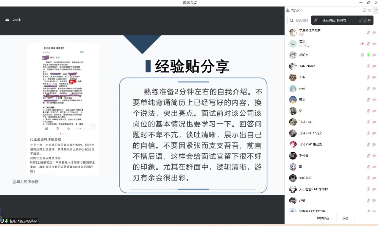 杨明杰则是从确定自我定位、简历内容准备、面试过程注意、面试后复盘与总结等四个方面进行了分享。提醒同学们在求职时,一是要积极就业,多方面了解求职信息,做好自身目标定位;二是认真准备简历,突出特长,在试错中不断优化;三是面试过程中要自信,逻辑清晰,展现优势;四是每场面试结束都要复盘和总结,及时发现自身问题,为下一次面试提前做好准备。