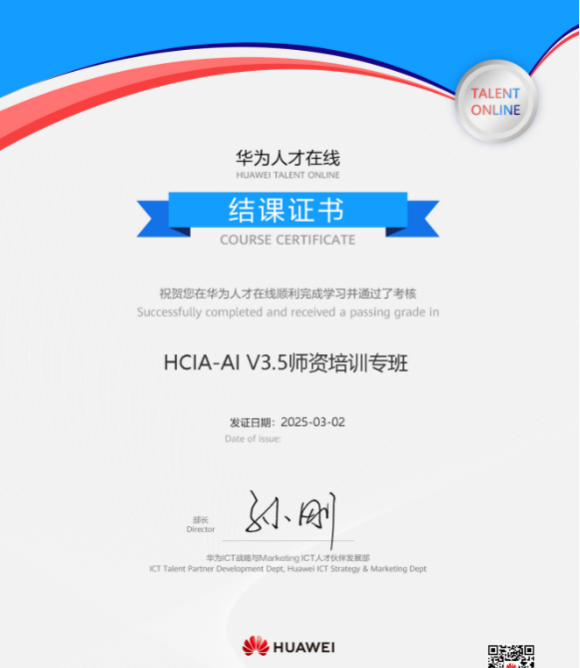 本网讯(通讯员:张棋飞)2025年3月1日~2日,华为联合“信息技术新工科产学研联盟”举办了人工智能专题师资培训,内容涉及人工智能概述、机器学习、深度学习、人工智能开发框架等。此次培训面向高校人工智能专业教师,内容聚焦人工智能前沿技术,采取理论与实践相结合的培训模式,以理论内容搭配实验案例进行操作,保障培训教师深入理解新技术知识。我院人工智能导论课程组选派老师全程参与了此次培训并顺利通过考核,获得了华为HCIA-AI培训认证。