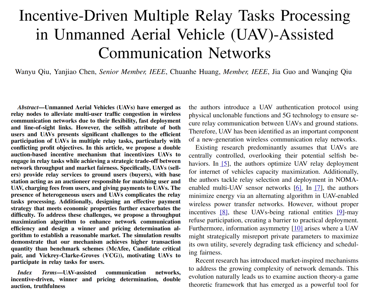 近日,我院邱晚玉博士以第一作者的身份在国际高质量期刊《IEEE Internet of Things Journal》上发表研究论文 “Incentive-Driven Multiple Relay Tasks Processing in Unmanned Aerial Vehicle (UAV)-Assisted Communication Networks” 。《IEEE Internet of Things Journal》发表物联网各领域的最新研究进展及综述论文,涵盖主题包括:物联网系统架构、物联网通信与组网协议、物联网服务与应用等。2025年影响因子为8.9,中科院1区。