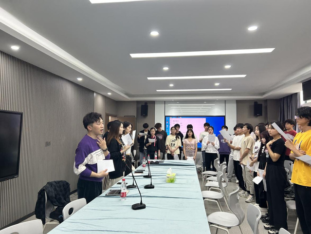 图为邓羽老师带领同学们进行歌曲合唱练习