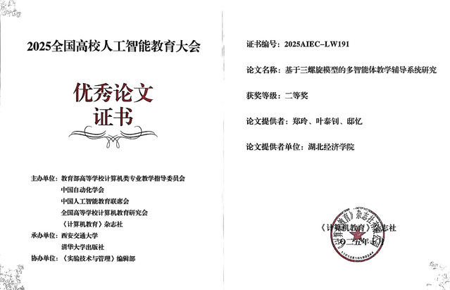 在大会优秀论文评选中,我院的教研成果得到大会主委会和同行专家的充分认可。该成果是我院湖北省高校教学改革项目的阶段性成果之一,主要聚焦新财经背景下人工智能在教学评价中的现实问题,利用“高校—产业—政府”三螺旋协同机制,创新构建多智能体辅导系统,实现“动态分层”与“产教融合”,充分展现了我院人工智能专业在课程构建、教学方法和实践平台方面的综合建设成效。(撰稿:郑玲,审核:吕植成)