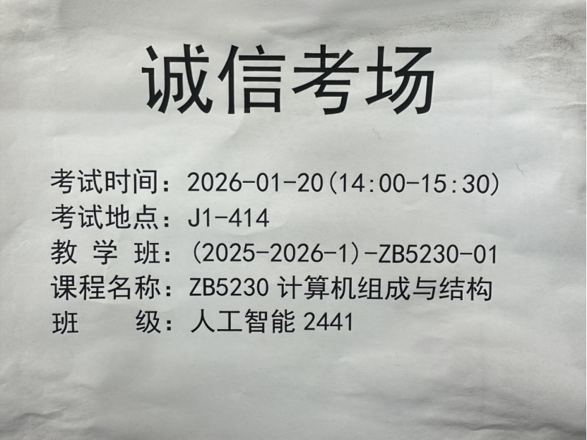 为深入推进学风建设,强化学生诚信考试意识,营造风清气正的育人环境,2026年1月20日下午,我院在J1-414教室组织开展了《计算机组成与结构》课程“诚信考场”专项考试。本次考试面向人工智能2441班全体学生,全程以“无人监考、诚信应考”的模式进行,旨在以考风促学风,引导学生树立诚信为本的价值观。