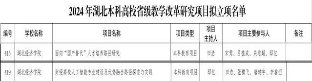 近日,湖北省教育厅高等教育处正式公示了2024年湖北本科高校省级教学改革研究项目拟立项名单,我院申报的两个项目成功入选,标志着我院在教育教学改革领域取得了新的重要突破。